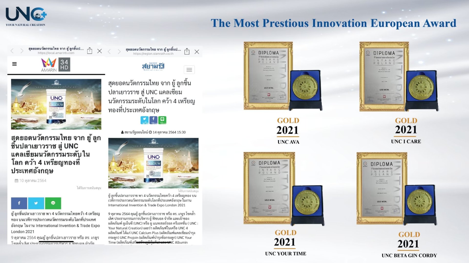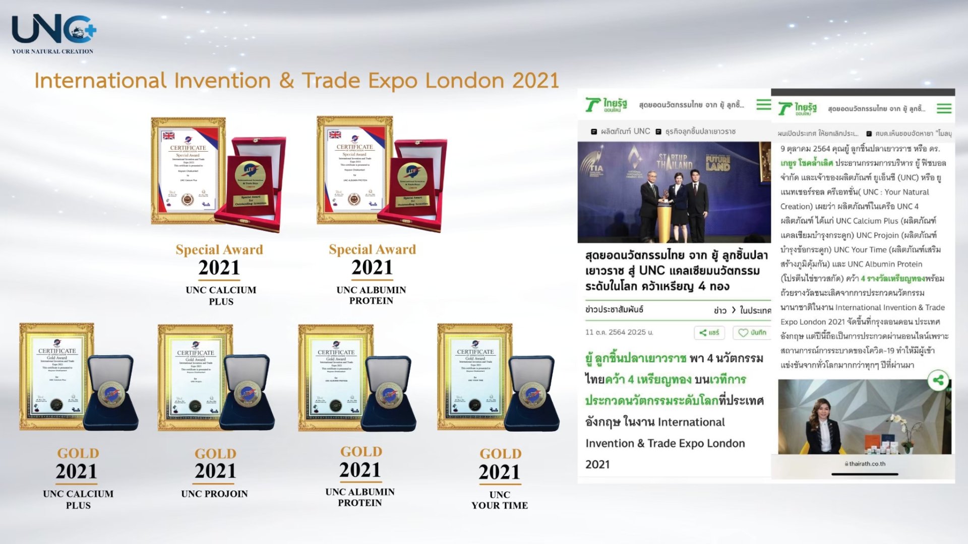 เช่นเดียวพิเศษของการแข่งนี้ เชื่อว่าทำให้คณะกรรมการตัดสินใจมอบ รางวัลเหรียญทอง 2 ปีซ้อน ให้กับ UNC Calcium เพราะผลิตภัณฑ์สกัดมาจากก้างปลาด้วยนวัตกรรมในการผลิต เป็นธรรมชาติ ไม่มีความพิษในระดับเซลล์ ที่มีโมเลกุลเล็กที่สุดในโลก กลายเป็นรูปแบบของแคลเซียมที่ดูดซึมได้ดีที่สุดของโลก โดยไม่มีผลข้างเคียง เนื่องจากเป็นผลิตภัณฑ์จากธรรมชาติ100% ซึ่งความสำเร็จนี้ UNC ได้รับการสนับสนุนทุนวิจัยจาก สำนักงานนวัตกรรมแห่งชาติ (NIA) และสภาหอการค้าไทย ทำให้นอกจากรางวัลการันตีล่าสุดแล้ว ตลอดระยะเวลา 4 ปี ในการก่อตั้งแบรนด์นี้มา ทำให้ผลิตภัณฑ์ของเราได้รับรางวัลเกียรติยศจากทั้งในและต่างประเทศรวมทั้งสิ้น 25 รางวัล และในสิ้นเดือนนี้สำนักงานการวิจัยแห่งชาติ (วช.) และ สภาหอการค้าไทย